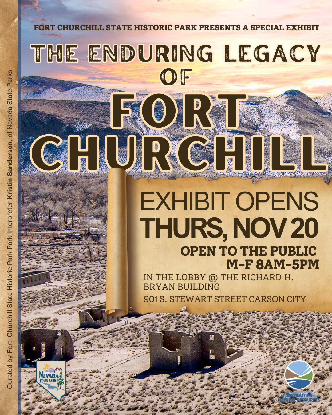 - The State Historic Preservation Office and Department of Conservation and Natural Resources is hosting the exhibit, "The Enduring Legacy of Fort Churchill" in the Lobby of the Bryan Building, 901 South Stewart Street, Carson City. Flyer.